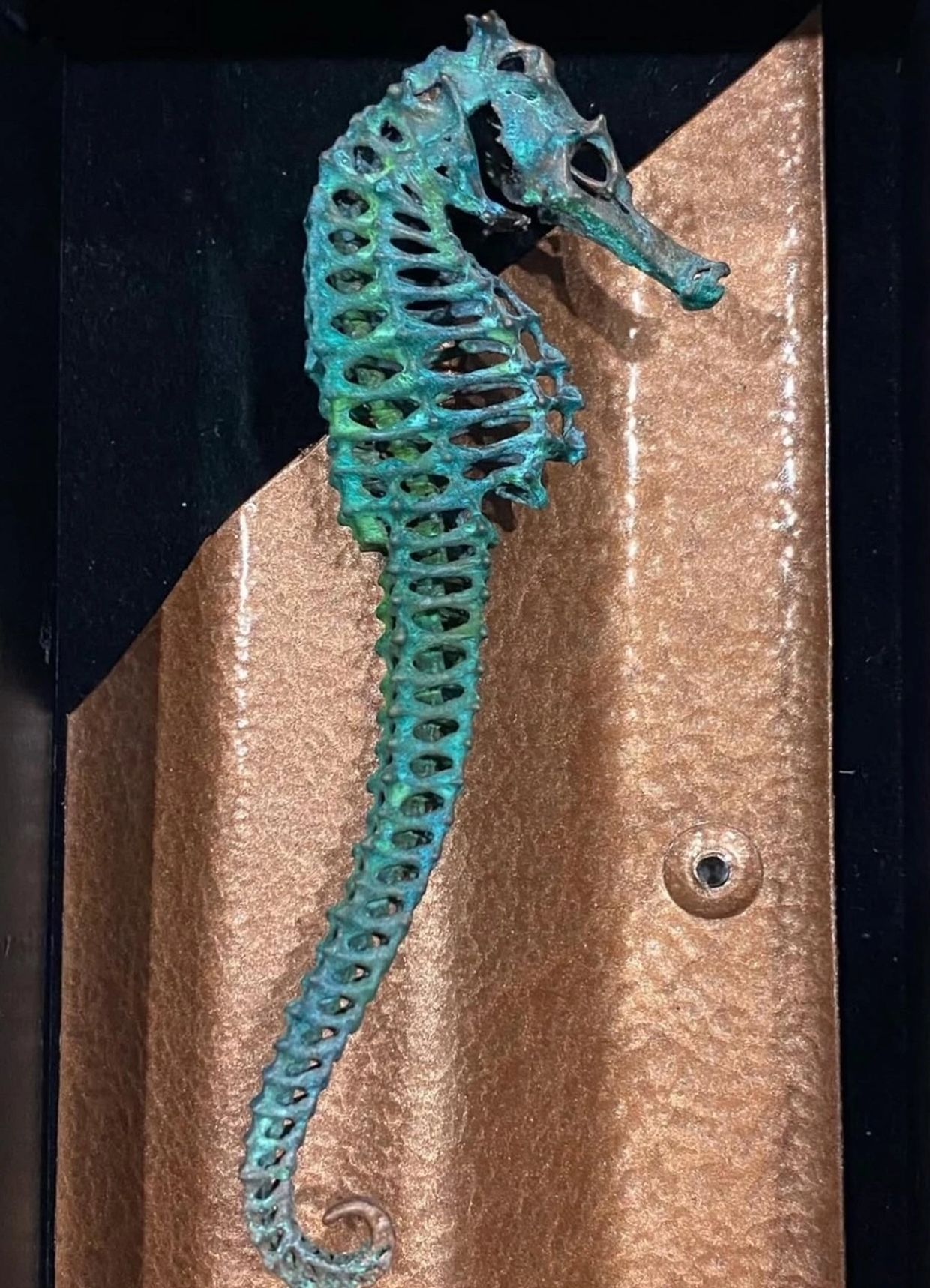 My artwork consists of metal plated fish bones, from both fresh water and salt water habitats, with a polished or patina finish. They are made from real fish skeletons (ethically sourced) that have been fully stripped and cleaned using dermestid beetles, reassembled by hand and coated with several layers of liquid metal (usually tin or copper). The typical piece will take 20-100 hours to complete, depending on the size and delicate nature of the fish. The longest portion is during the assembly phase. It’s much like a jigsaw puzzle in that the skeleton has to be completely reassembled by hand, one bone at a time. It is a very similar process that museums and taxidermists use to produce animal skeletons for display. The metal application is 3-4 layers with the final layer including the patina acid. Once the “metalization” process is finalized a clear coat sealer is applied in order to preserve the appearance. Each artwork is completed with a custom mount or shadow box that best fits the unique piece.